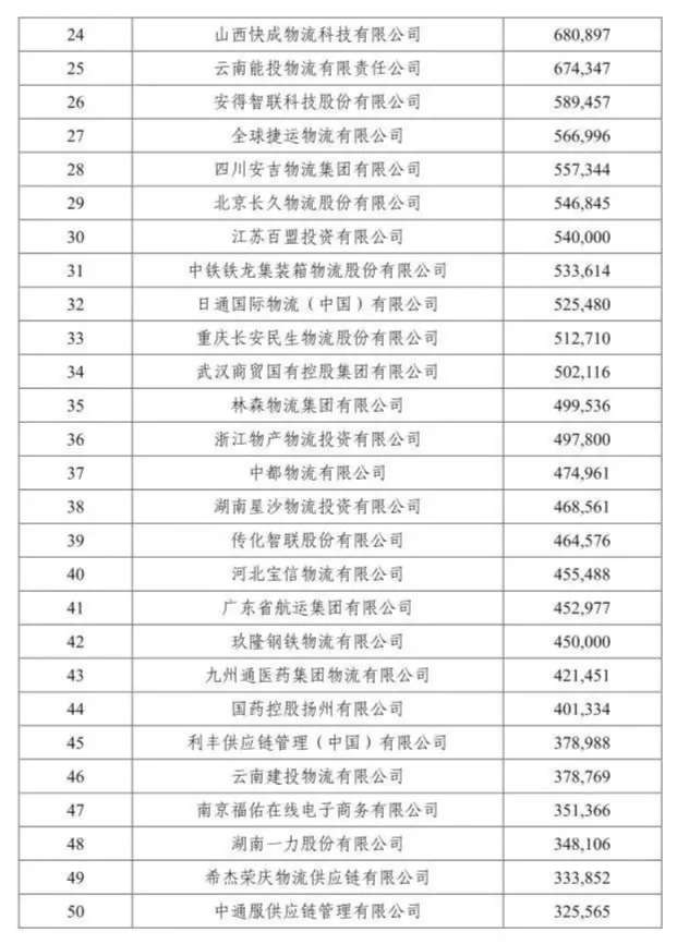 該榜單由中國物流與采購聯(lián)合會組織評選,按照重點物流企業(yè)統(tǒng)計調(diào)查結(jié)果提出了2019年度中國物流企業(yè)50強(qiáng)排名。據(jù)悉, 50強(qiáng)物流企業(yè)2018年物流業(yè)務(wù)收入合計9833億元,按可比口徑計算,同比增長16.9%。50強(qiáng)物流企業(yè)門檻提高到32.6億元,比上年增加3億元。