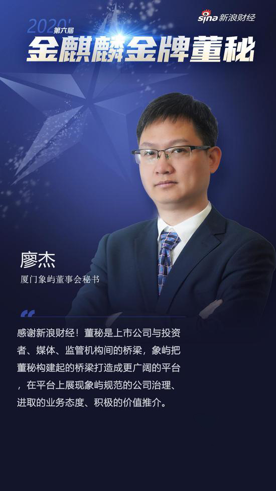 廈門象嶼董事會(huì)秘書廖杰獲評(píng)新浪財(cái)經(jīng)“2020年度金麒麟·金牌董秘”