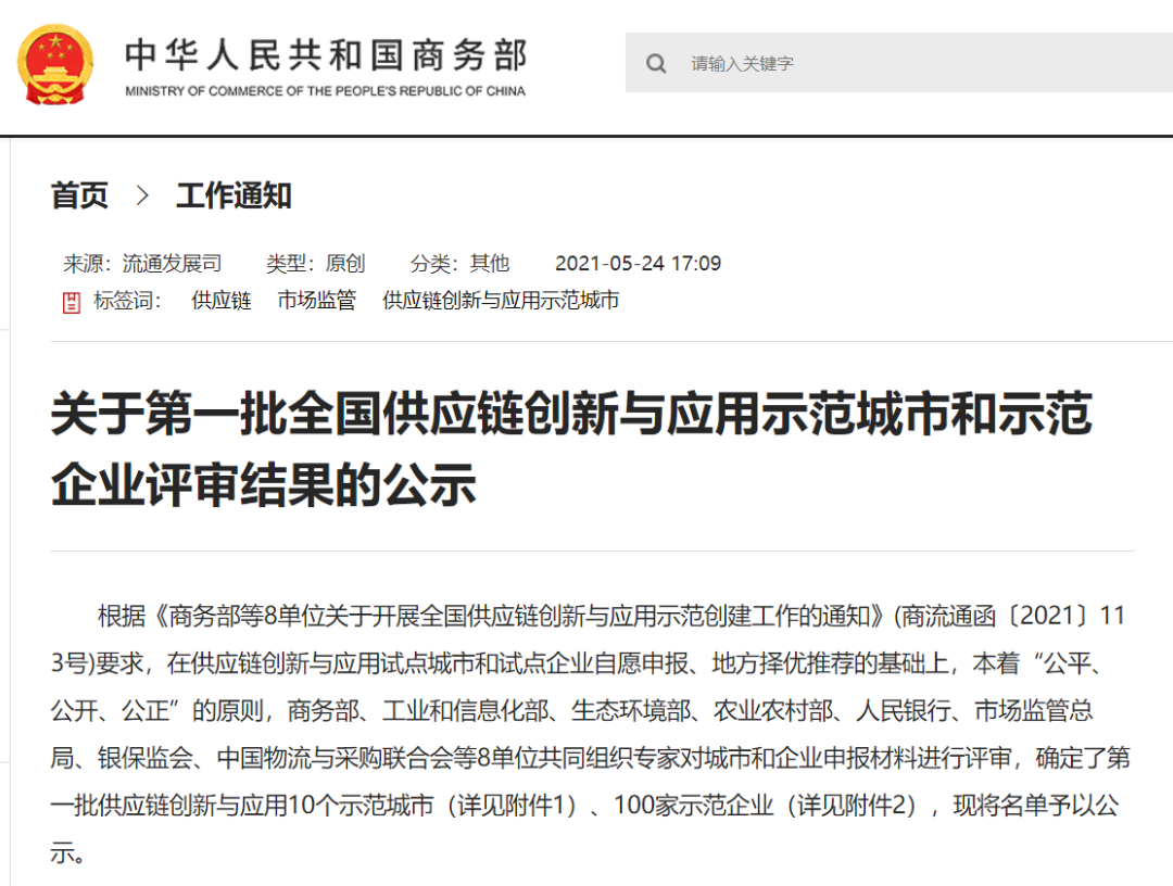 商務(wù)部此次公示的“全國(guó)供應(yīng)鏈創(chuàng)新與應(yīng)用示范城市和示范企業(yè)評(píng)審結(jié)果”,是商務(wù)部、工業(yè)和信息化部、生態(tài)環(huán)境部、農(nóng)業(yè)農(nóng)村部、人民銀行、市場(chǎng)監(jiān)管總局、銀保監(jiān)會(huì)、中國(guó)物流與采購(gòu)聯(lián)合會(huì)等8單位共同組織專家對(duì)城市和企業(yè)申報(bào)材料進(jìn)行評(píng)審確定的結(jié)果。