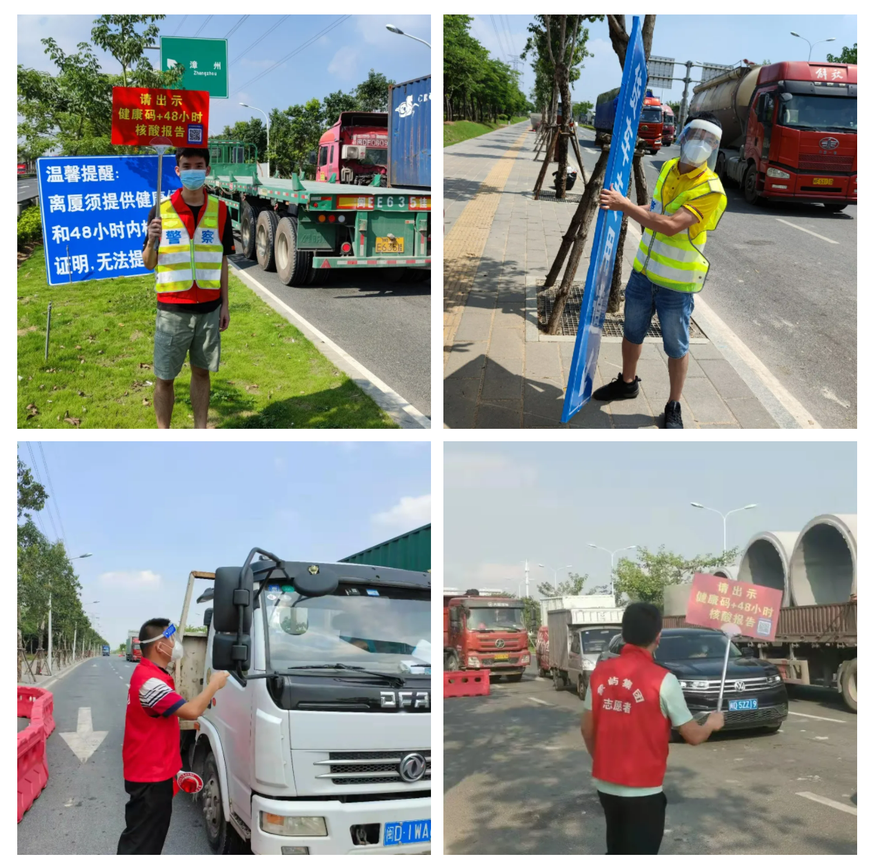 在海滄海翔大道東埔村,遠遠就能看到象嶼股份志愿者手持指引牌,“請出示健康碼+48小時核酸報告”,他們正在開展交通防控協(xié)管工作。他們在路口一站就是8小時,凌晨24點到早上8點的夜班更是對志愿者們體力與毅力的考驗。